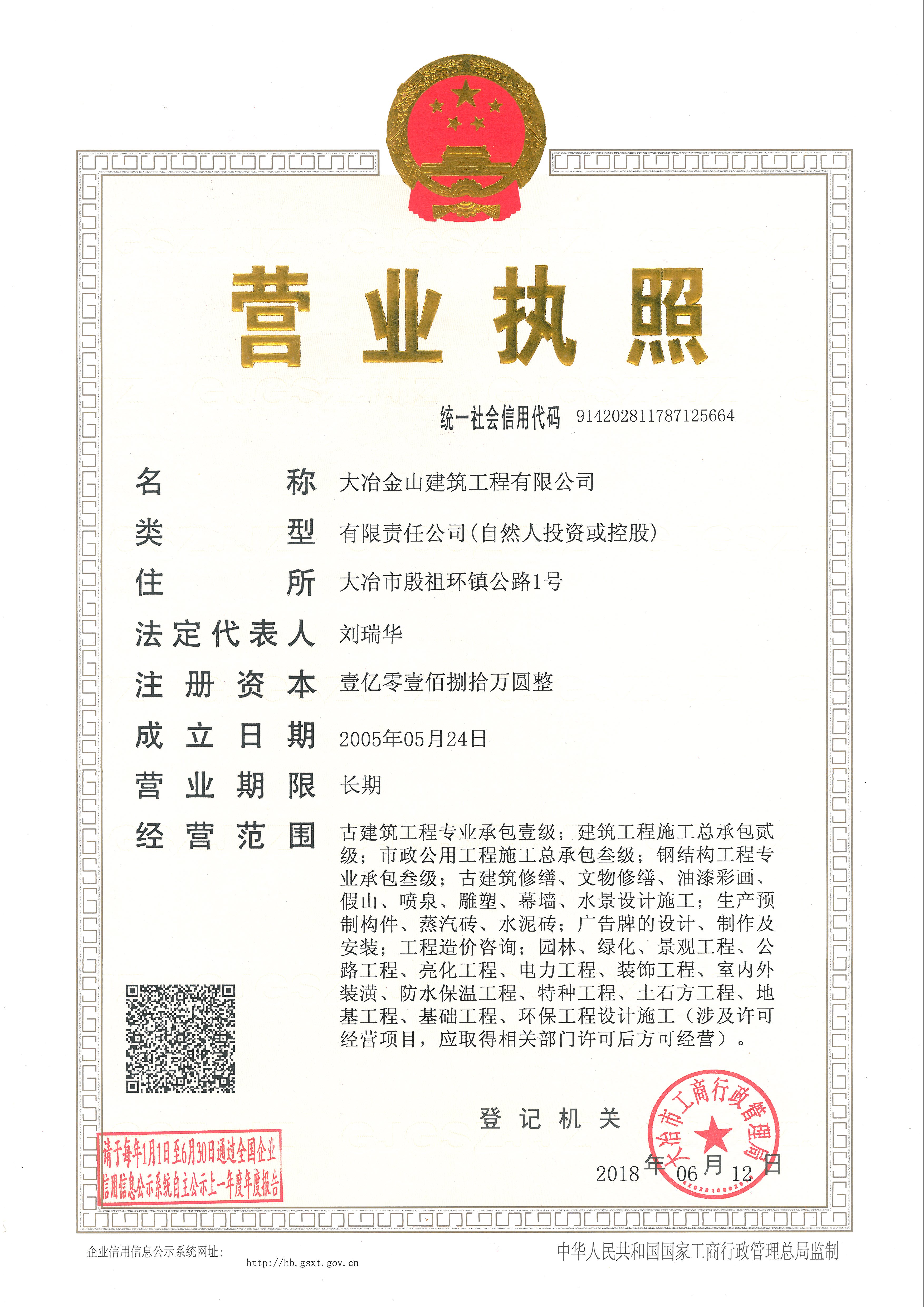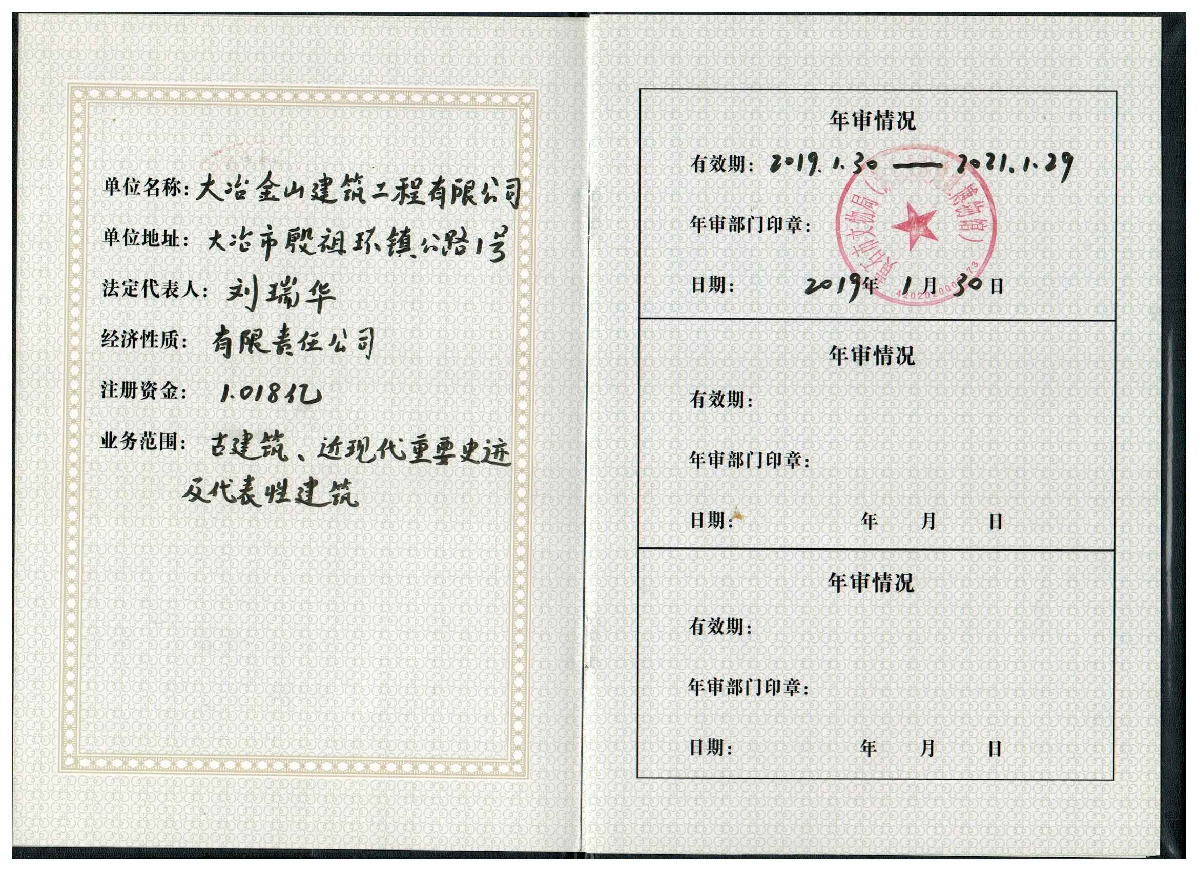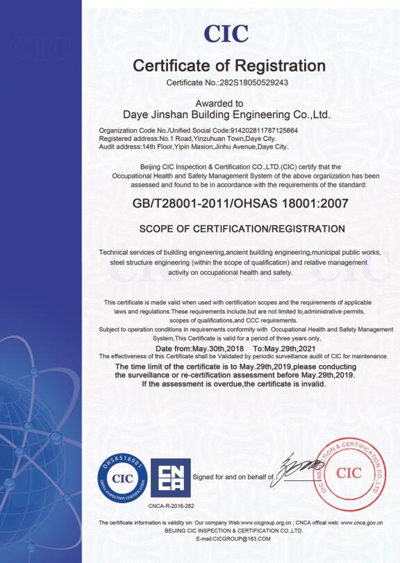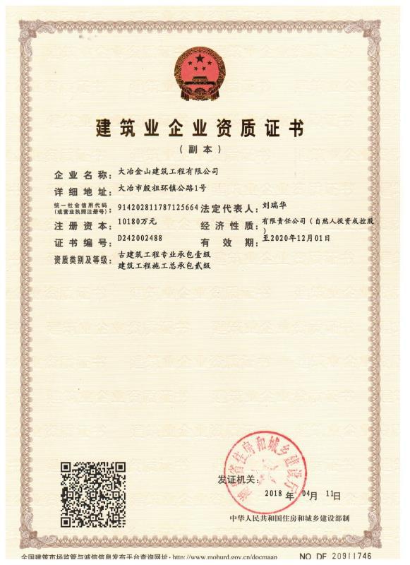 大冶金山建筑工程有限公司始建于1984年,屬鎮(zhèn)辦集體企業(yè)。1997年改制為大冶山建筑工程有限責(zé)任公司,屬股份制企業(yè)。2013年更名為大冶金山建筑工程有限公司,2018年3月公司資源重組,公司注冊(cè)資金達(dá)到10180.00萬(wàn)元,公司法定代表人為劉瑞華。公司具有古建筑工程專(zhuān)業(yè)承包壹級(jí)、建筑工程施工總承包貳級(jí)、市政工程總承包叁級(jí)、鋼結(jié)構(gòu)工程專(zhuān)業(yè)承包叁級(jí)資質(zhì)。